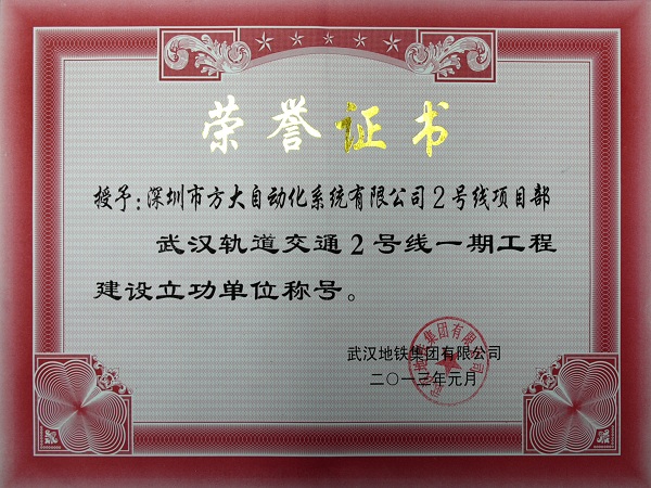 近日,为表彰方大自动化系统有限公司在武汉地铁2号线一期工程中的突出贡献,武汉地铁集团有限公司授予方大自动化系统有限公司为 “武汉轨道交通2号线一期工程建设立功单位”称号。