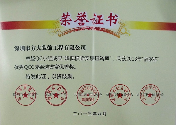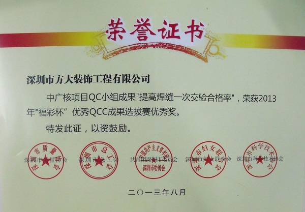 2013年9月24日,方大装饰工程有限公司获得由深圳市质量协会、深圳市总工会、共青团深圳市委员会、深圳市妇女联合会和深圳市科技技术协会联合颁发的“2013年深圳市质量管理小组活动优秀企业”称号。同日,由深圳市质量协会、深圳市总工会、共青团深圳市委员会、深圳市妇女联合会和深圳市科技技术协会联合评定的“福彩杯”优秀QCC成果选拔赛优秀奖揭晓。方大装饰公司卓越QC小组成果“降低横梁安装扭转率”、中广核项目QC小组成果“提高焊缝一次交验合格率”和方大自动化系统有限公司门机梁皮带夹改造QC小组成果“提高门机梁传动系统组装合格率及使用寿命率”被授予 “深圳市2013年‘福彩杯’QCC成果选拔赛优秀奖”;集团公司企业管理部尚清波获得“深圳市质量管理小组活动优秀推进者” 称号。