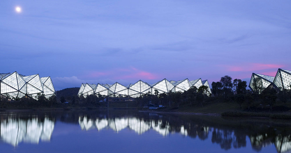 深圳大运中心体育场馆率先在国内体育场馆建设中引入以聚碳酸酯板(PC板)作为屋面材料面板,PC板是一种科技循环利用的高新低碳环保材料,相同厚度只有普通玻璃重量的50%,隔热性能比普通玻璃提高了25%,冲击强度时普通玻璃的250倍,并具有良好的透光性、抗冲击性及耐紫外线辐射性能,同时还具有良好的尺寸稳定性和成型加工系能。