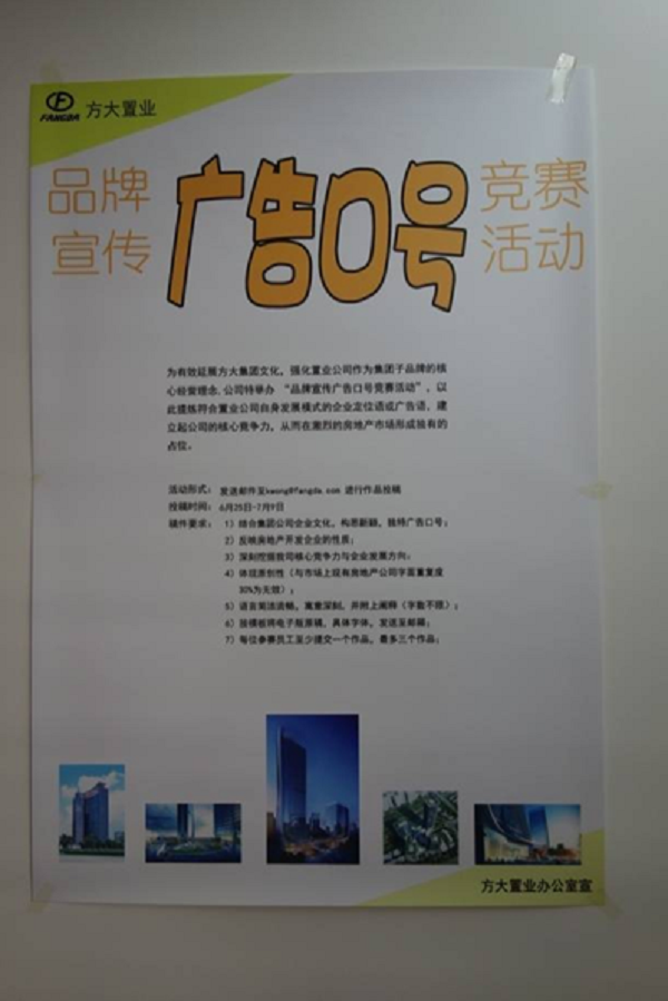 7月16日,方大置业“品牌宣传广告语口号竞赛”活动决赛在方大广场综合楼三楼会议室举行。经过三周时间的征稿、作品展示、初选、复选,最终选出了十篇优秀作品进入决赛。方大置业总经理及相关领导、办公室和营销策划部负责人担当本次决赛评委。
