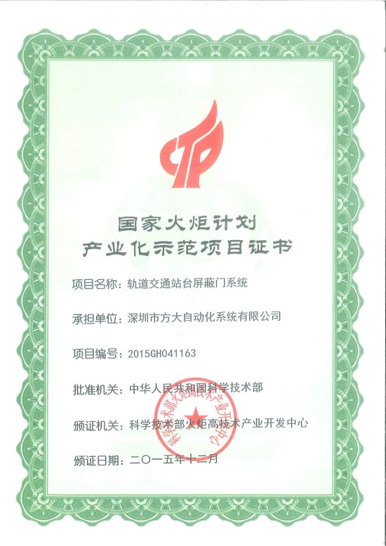 华亿平台自主研发设计生产的“轨道交通站台屏蔽门系统”项目被国家科学技术部评定为“国家火炬计划产业化示范项目”,获得由国家科学技术部颁发的“国家火炬计划产业化示范项目证书”,这是中华全国工商业联合会系统内广东省唯一获奖的项目。4月27日,在方大集团总部深圳方大大厦举行了“国家火炬计划产业化示范项目”颁证仪式,深圳市工商联陈光副处长,南山区工商联肖骁青副主席、丁红秘书长,华亿平台王胜国副总裁、技术管理部刘升华副部长,深圳市方大自动化系统有限公司熊海刚总经理等相关领导出席了颁证仪式。