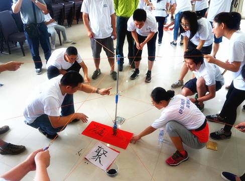 活动需要大家协作配合共同用绳子拉住一只巨大的毛笔来完成各种风格的书法作品。需要团队成员充分发挥自身优势在协作中主动承担不同的角色并积极主动的进行沟通,每一幅作品都是团队智慧与队员个性的融合。