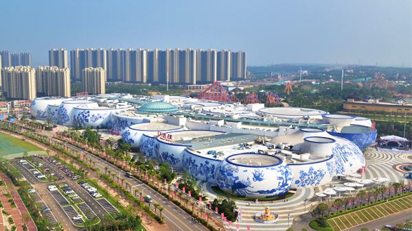 南昌万达茂是全球目前为止体积最大的以青花瓷为主题的商业建筑,其造型为26个瓷罐,既形态各异,整体上又浑然一体。外幕墙设计以青花瓷为主题,充分融入江西地方元素,完整地体现了江西赣瓷文化特色,淋漓尽致地展示出了中华瓷都的文化古韵与现代幕墙科技之美。