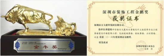 近日,由方大集团全资子公司深圳市方大建科集团有限公司(简称:方大建科)承建幕墙工程的深圳中信银行大厦分别获得由深圳市建筑业协会颁发的金牛奖、由深圳市装饰行业协会颁发的金鹏奖两项荣誉。