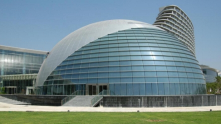 在幕墙安装阶段,方大团队在施工方法上大力创新。针对建筑正面肋点式玻璃幕墙跨度大的情况(最大跨度达到16米),考虑到建筑美观及功能使用要求,采用了拉杆玻璃肋相结合的幕墙新形式,既通透美观,同时又有效的减小了对室内空间的占用。该项目音乐厅为半椭球形,高度达25米。其奇特的造型给幕墙施工增加了不少的难度。方大团队采用三维空间电脑模拟放线定点技术,精准安装,完美复原了音乐厅幕墙设计效果。