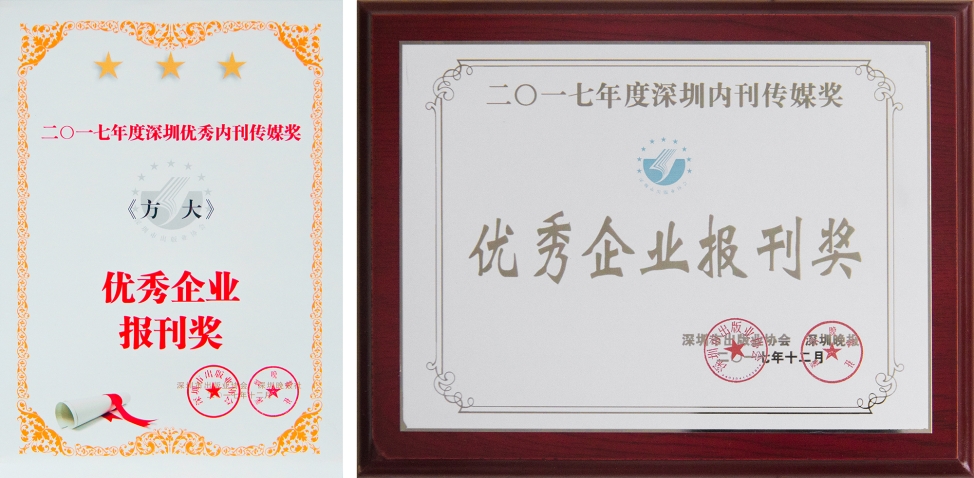《方大》凭借大气精美的版面设计、爽朗舒适的编排风格以及务实精准的报道内容多次获得“深圳优秀内刊传媒奖”,已成为企业展现形象风采、员工学习交流的好平台和客户了解方大集团的好窗口,是方大集团一张靓丽的名片。