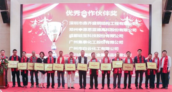 答谢会同时举行了优秀合作伙伴颁奖典礼,表彰了2017年度在质量、技术、服务等方面做出杰出贡献的合作伙伴,江门耀皮工程玻璃有限公司等十五家企业荣获优秀合作伙伴奖。