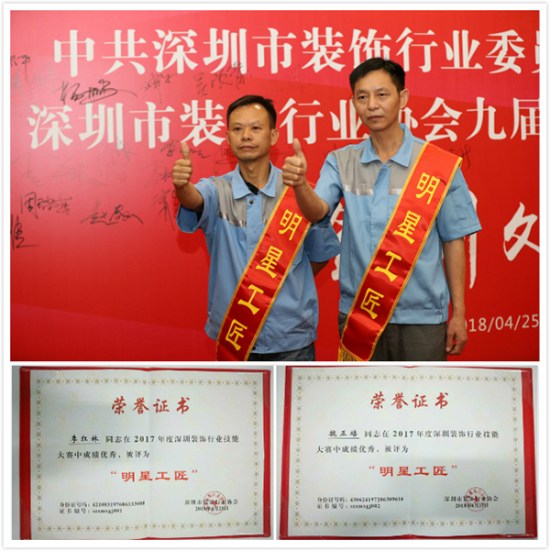 日前,深圳市方大建科集团有限公司员工李红林、魏正培,凭借过硬的技术、精湛的工艺,在深圳市装饰行业明星工匠评选活动中脱颖而出,荣获“明星工匠”称号。