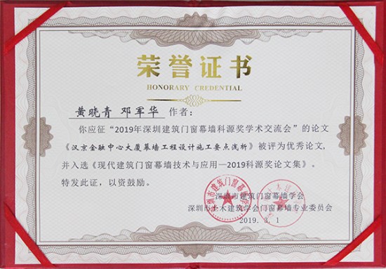 本次学术交流会上,方大建科发表了文林编写的《竖向大线条插接型单元幕墙设计浅析》、黄晓青、邓军华编写的《汉京金融中心大厦幕墙工程设计施工要点浅析》、杨全新编写的《新型工业化幕墙的发展思路》共三篇论文并入选《现代建筑门窗幕墙技术与应用》论文集,其中《竖向大线条插接型单元幕墙设计浅析》与《汉京金融中心大厦幕墙工程设计施工要点浅析》被评为优秀论文。