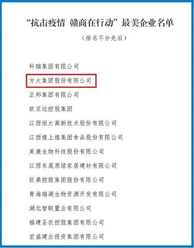 近日,江西赣商联合总会、赣商杂志社发布关于表彰在“抗击疫情 赣商在行动”活动中最美商会、最美企业、最美企业家的通报,表彰赣商企业和江西商会在抗击疫情中做出的突出贡献,方大集团荣获最美企业称号。