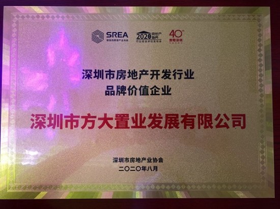 特区40载——方大置业公司三度蝉联深圳市房地产开发行业品牌价值企业