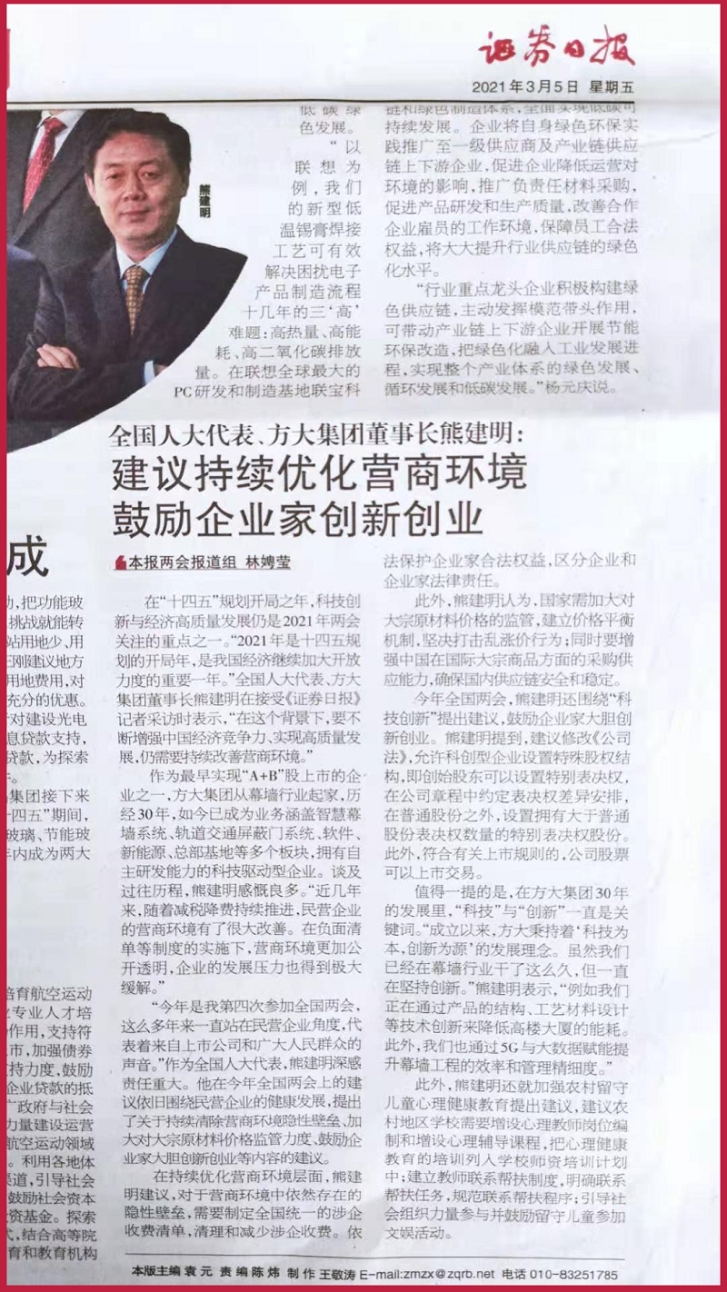 在“十四五”规划开局之年,科技创新与经济高质量发展仍是2021年两会关注的重点之一。“2021年是十四五规划的开局年,是我国经济继续加大开放力度的重要一年。”全国人大代表、方大集团董事长熊建明在接受《证券日报》记者采访时表示,“在这个背景下,要不断增强中国经济竞争力、实现高质量发展,仍需要持续改善营商环境。”