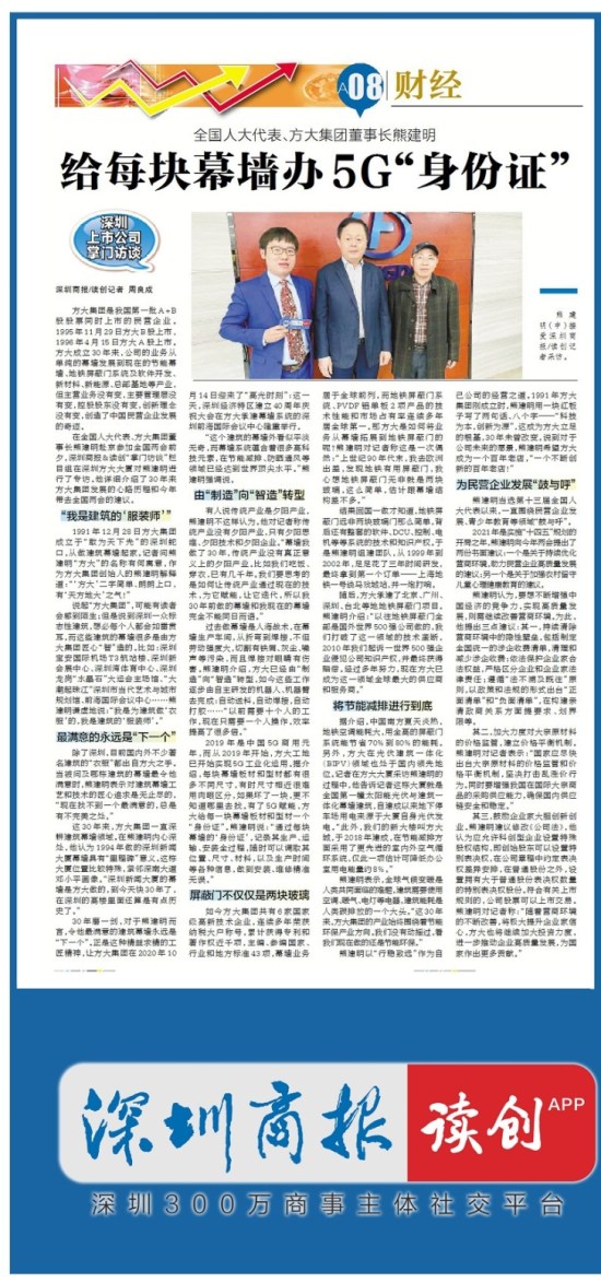 3月8日,深圳商报刊发方大集团董事长熊建明两会专访报道《全国人大代表、方大集团董事长熊建明:给每块幕墙办5G“身份证”》