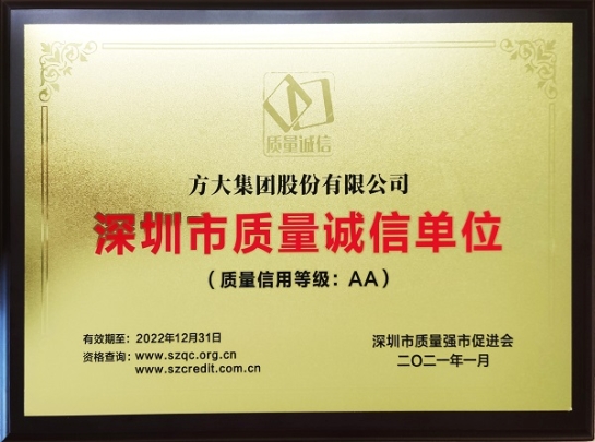 近日,深圳市质量强市促进会公布了质量诚信(示范)单位认定名单,方大集团获得“深圳市质量诚信单位”认证。